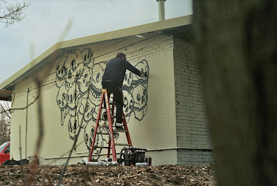 on february 18th this year, erik lundquist painted a mural on the graffiti wall at homewood skate park. using white house paint and a six cans of black spray paint, he finished the whole thing in about five hours. unfortunately, it was covered pretty quickly, surviving as a backdrop to the mini ramp for only a couple days.